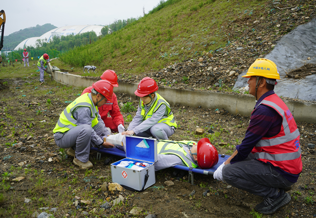 演练模拟连续暴雨天气,3 小时降雨量达50毫米以上,2号排土场74平台排水沟上部边坡出现局部滑塌,排水沟发生淤堵,同时有1名现场人员在巡查中不慎受伤。